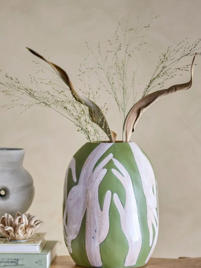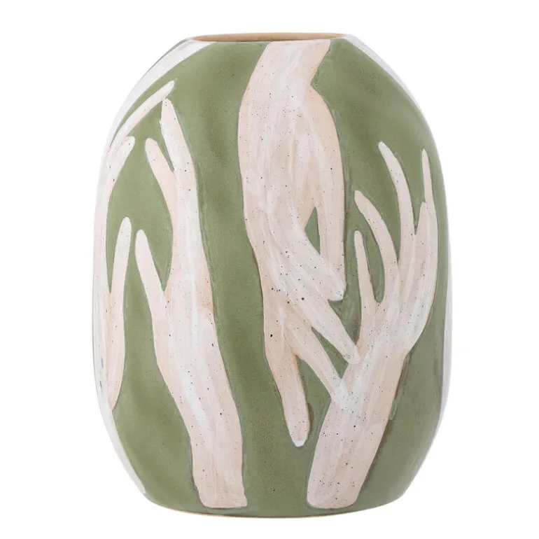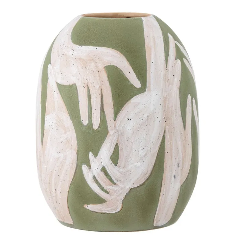 De Bloomingville Adalena vaas is kunstzinnig en opvallend met zijn frisgroene handgeschilderde motief van dansende handen. Gebruik het als kunstwerk of voor bloemen. Afmeting Ø23,5×30,5cm