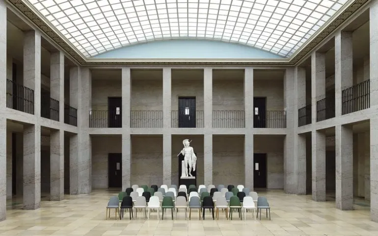 Materiaal: polypropylene, poten eikenhout, zitting gevlochten riet