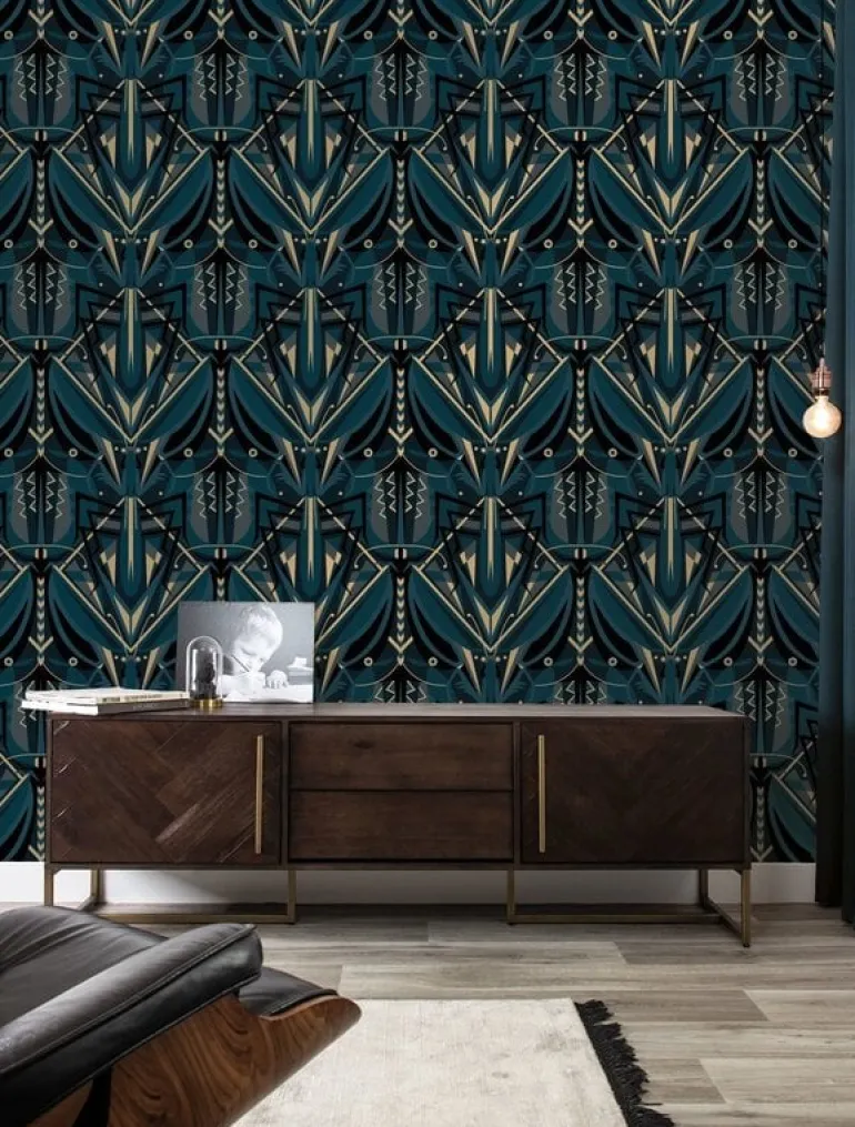 Prachtig goud behang met een mooie zijdeglans uitstraling van KEK Amsterdam. Het KEK Amsterdam Art deco animaux grasshopper in jaren 30 stijl is een echte eyecatcher op de muur. Beschikbaar in verschillende kleuren. Afmeting 50 cm x 10 m