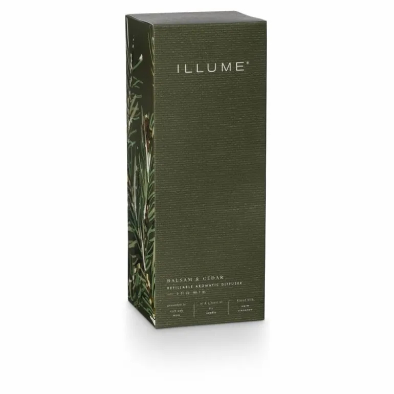 De Illume Balsam & cedar scent diffuser met de geur van rijk eikenmos met een hart van dennennaalden gekust met warme kaneel. Zorgvuldig vervaardigd met de hoogste kwaliteit. Vegan, dierproefvrij, alcohol vrij en een inhoud van 88,7ml. Afmeting Ø8x7cm