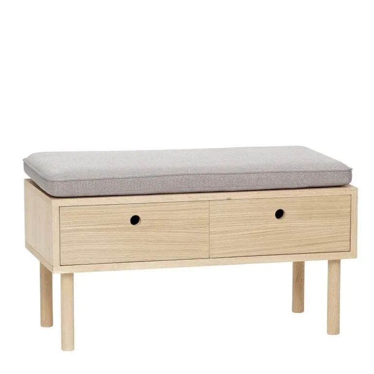 Hübsch bank met twee lades Dit mooie Hübsch bankje is gemaakt van eikenhout en voorzien van grijs kussen. Ook beschikt het bankje over een twee opbergvakken. Handig!