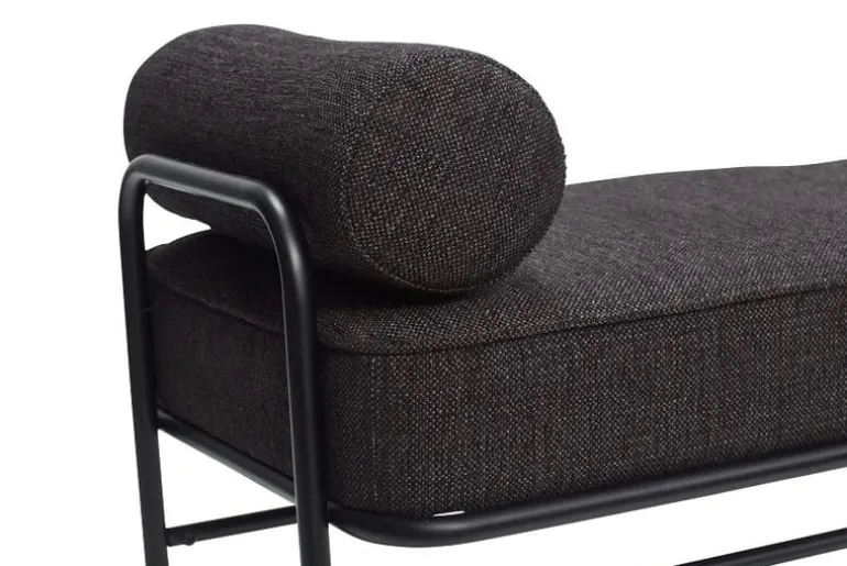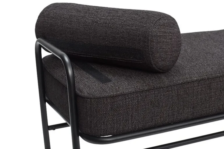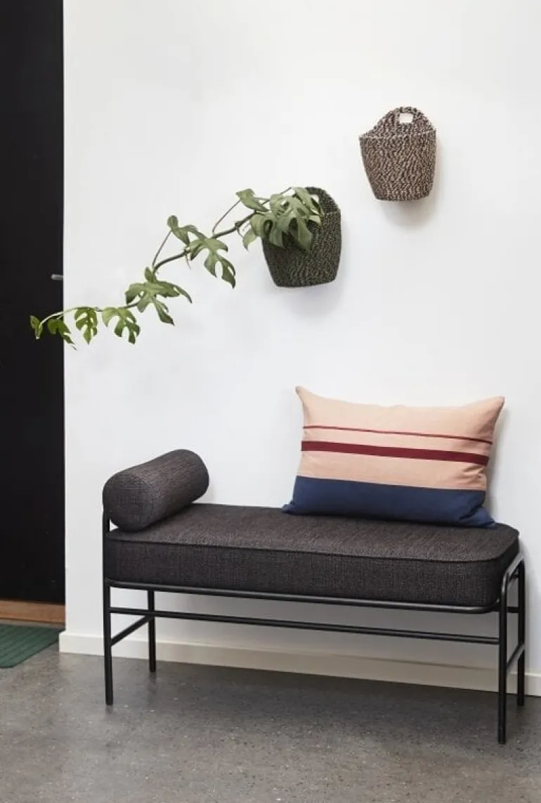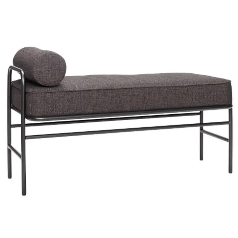 Moderne Hübsch designbank. Deze minimalistische Hübsch bank is gemaakt van hout met zwart metaal onderstel. Bankje wordt geleverd inclusief kussens. Tijdloos Deens design! Afmeting 106x47xh61cm