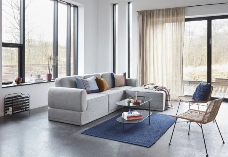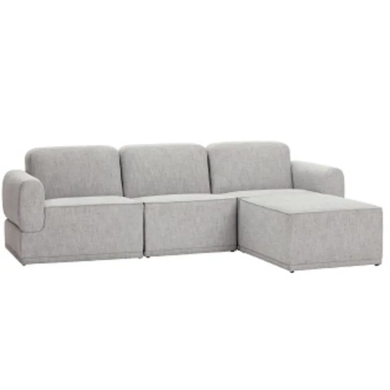 Moderne 3-zits bank van het Deense Hübsch. Deze Hübsch bank is gestoffeerd met een lichtgrijze stof. Extra comfortabel door de meegeleverde poef. Afmeting 286x87xh87cm