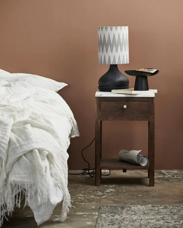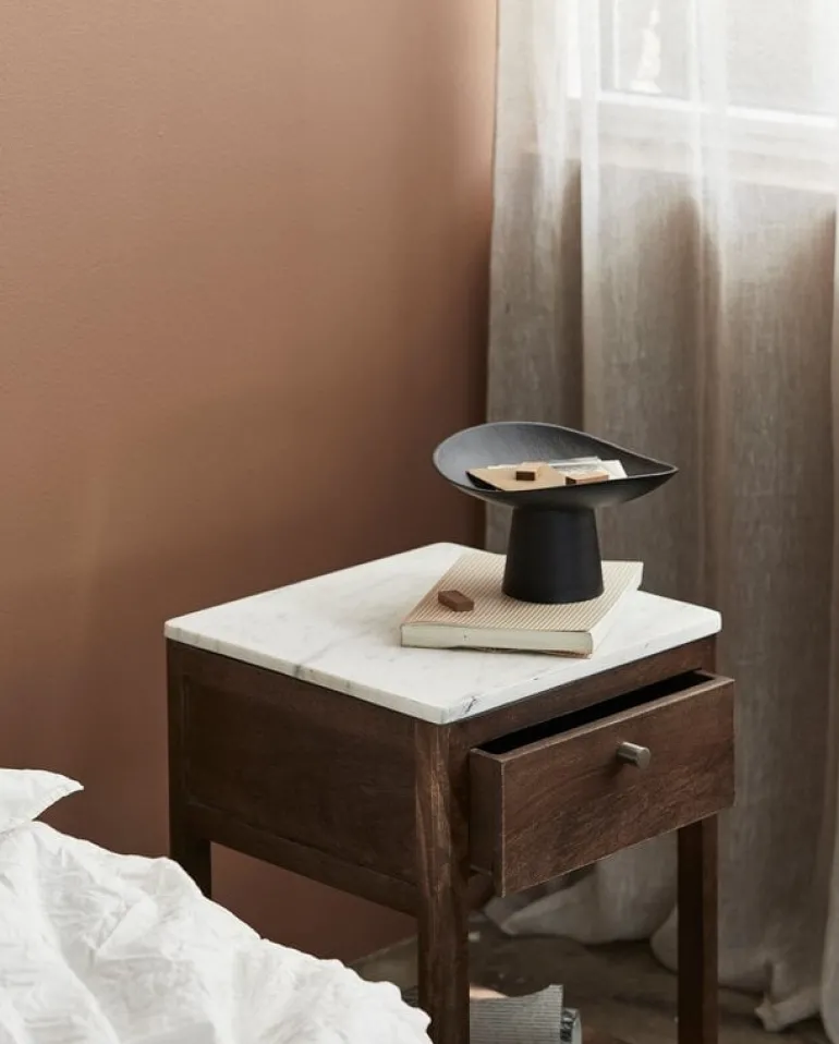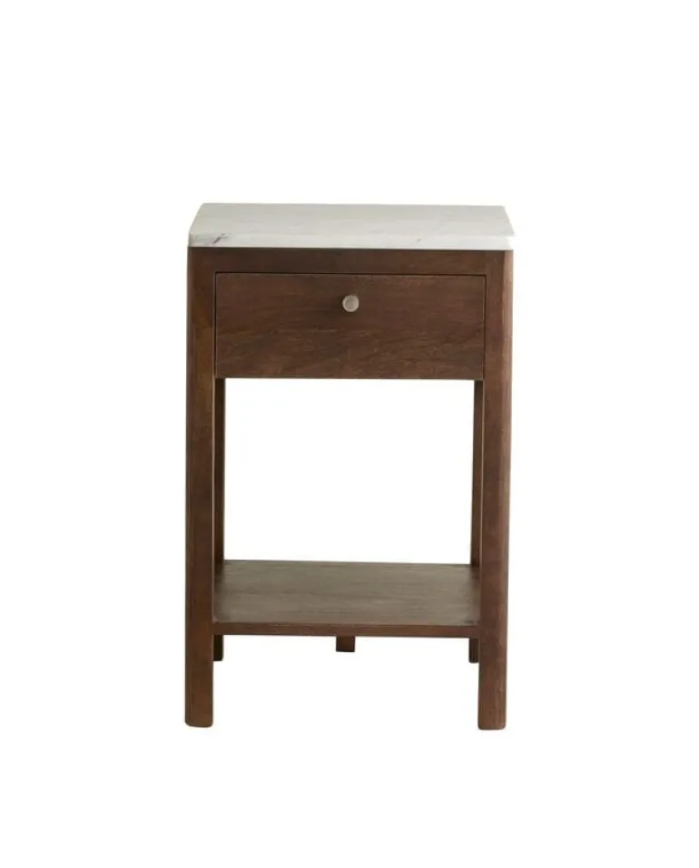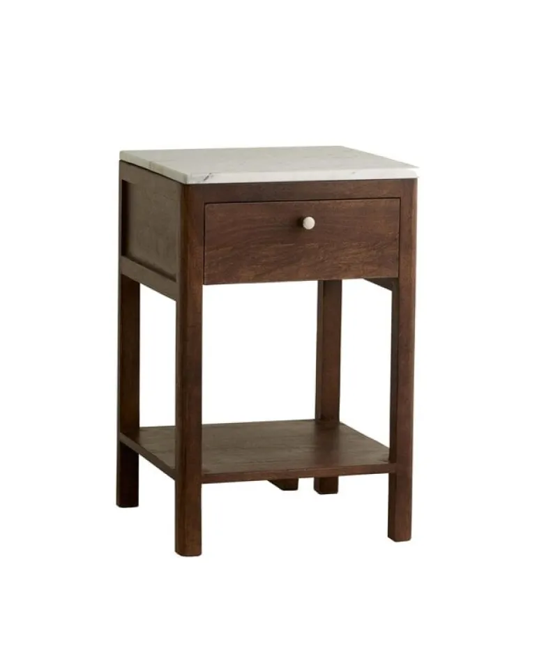 Leuk nachtkastje van het Deense interieurmerk Nordal. Het Nordal Bille nachtkastje is gemaakt van mangohout met een marmeren blad. Gebruik als nachtkastje of als bijzettafel. Afmeting 40,5×40.5x60cm