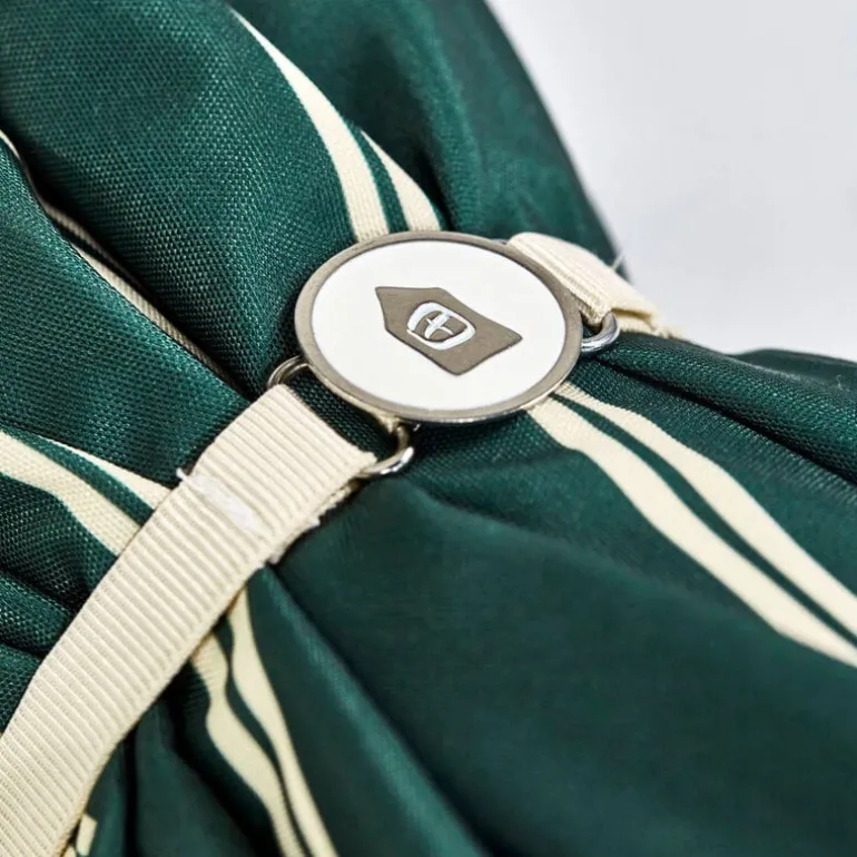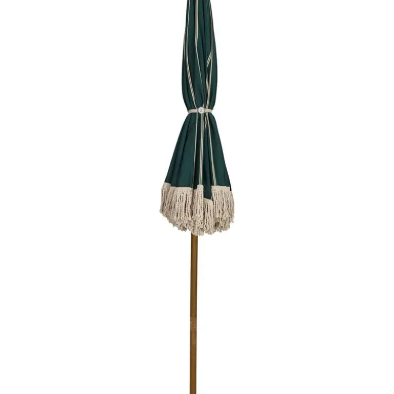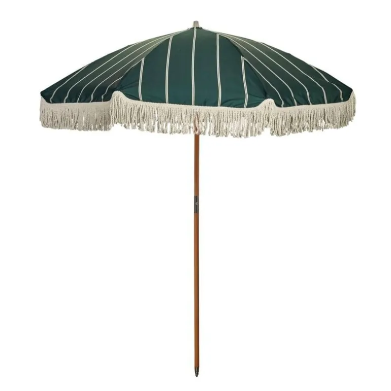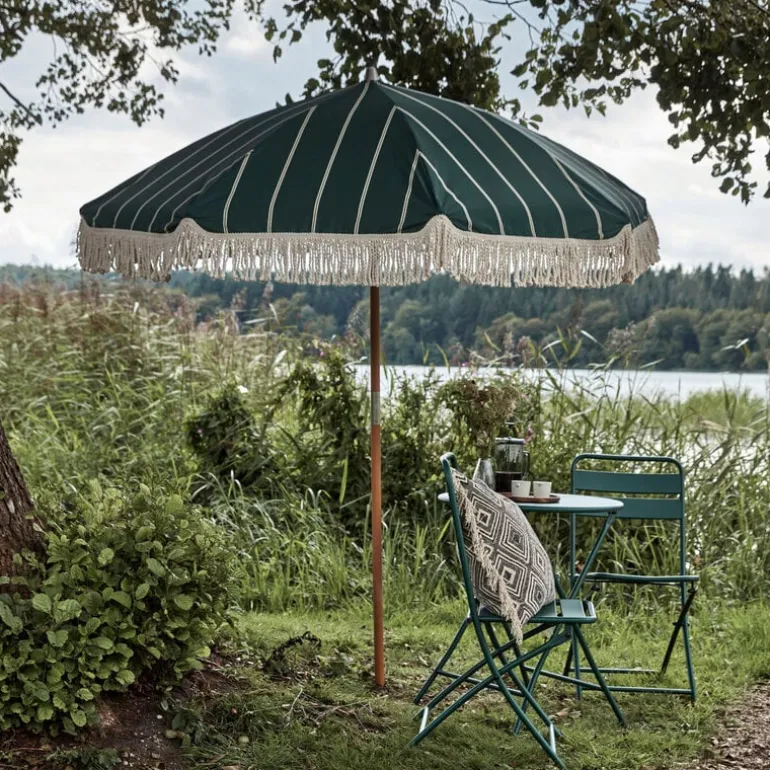Geniet van een warme zomerdag in de schaduw dankzij de House Doctor Block parasol. Beige strepen op een donkergroene achtergrond komen samen met franjes om de finishing touch te geven. Afmeting Ø190x230cm