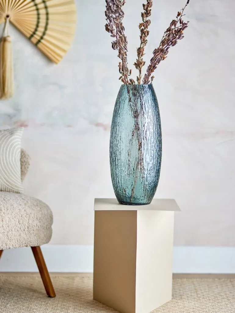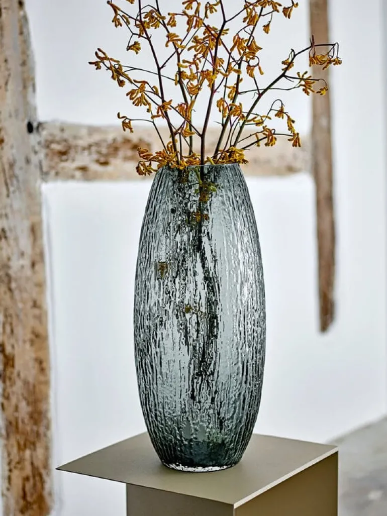 De Bloomingville Brock vaas is een grote vaas van rookkleurig, mondgeblazen glas. De vaas heeft een golvende structuur. Afmeting Ø22x50cm
