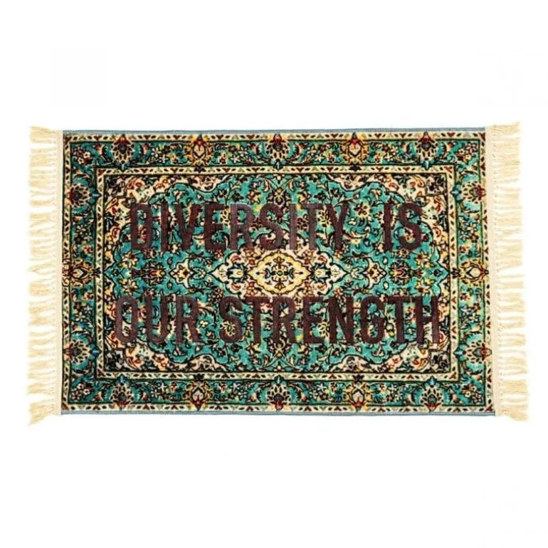 Kleurrijk vloerkleed van het interieurmerk Seletti. Het Burnt vloerkleed Diversity is gemaakt van polyester en op het kleed staat de tekst ‘Diversity is our strength’. Beschikbaar in verschillende uitvoeringen. Afmeting 80x120cm
