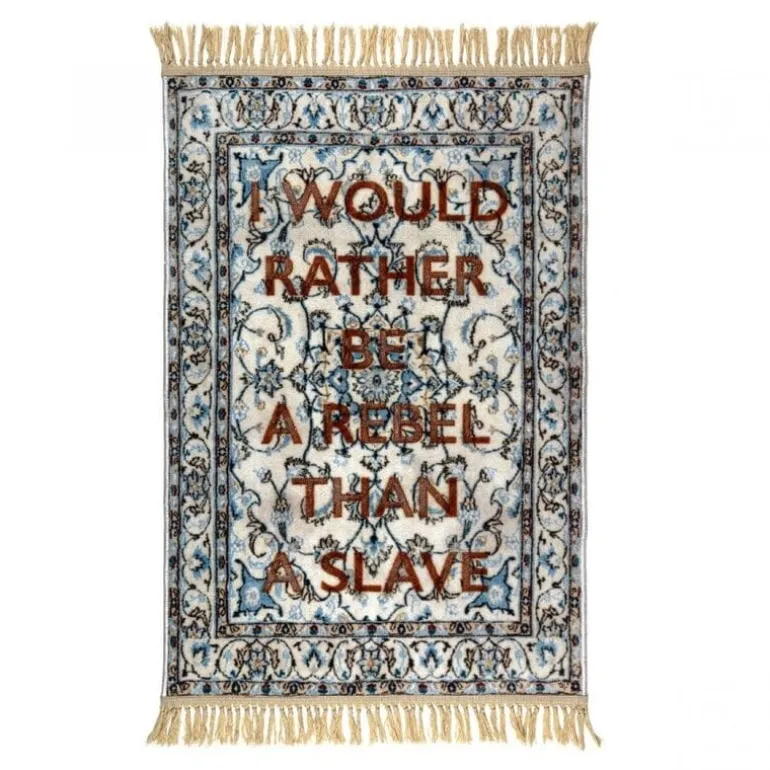 Kleurrijk vloerkleed van het interieurmerk Seletti. Het Burnt vloerkleed rebel is gemaakt van polyester en op het kleed staat de tekst ‘I would rather be a rebel than a slave’. Beschikbaar in verschillende uitvoeringen. Afmeting 80x120cm