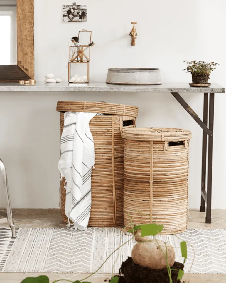 Prachtige House Doctor Chaka manden set. Deze manden zijn gemaakt van rotan en bamboe. Kan gebruikt worden als wasmand maar natuurlijk ook als opberger in bijvoorbeeld de woonkamer. Set van 2 stuks met verschillende afmetingen.