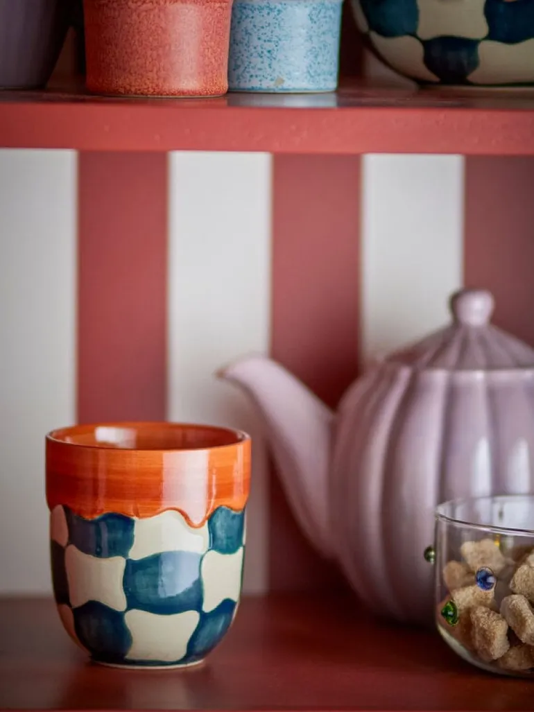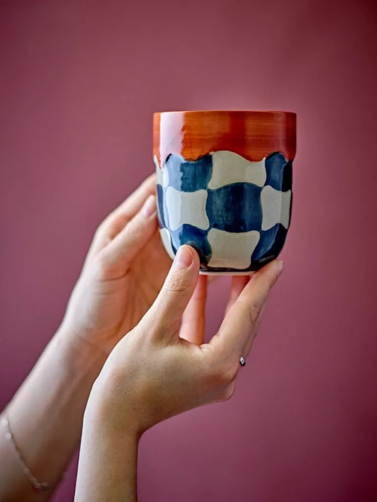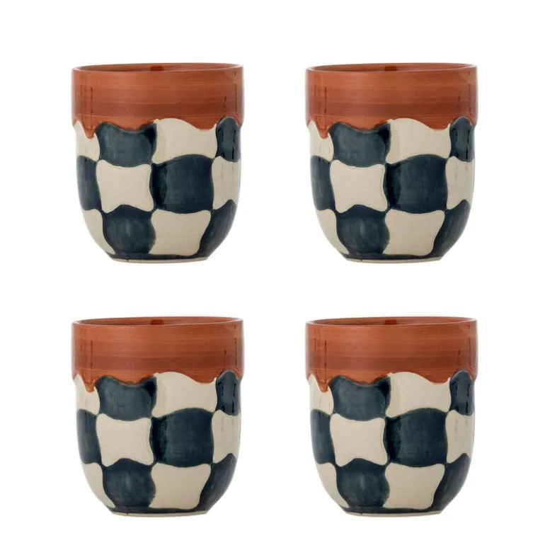 De Bloomingville Check mokken worden geleverd in een set van 4 stuks. Gemaakt van aardewerk en met de hand beschilderd. Het grafische patroon varieert licht in ontwerp en kleurintensiteit, waardoor elke mok uniek is. Afmeting Ø9x10cm