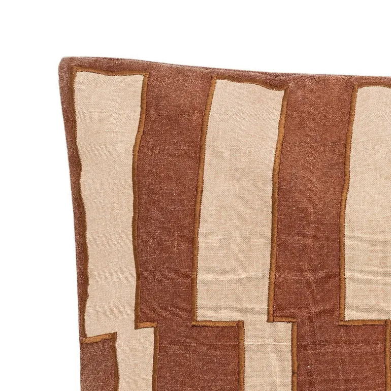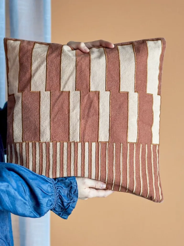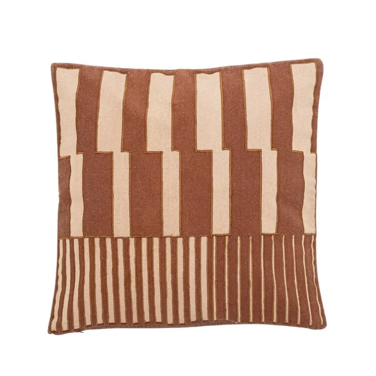 Het Bloomingville Cowes kussen is geborduurd met een geometrisch patroon in warme kleurtinten. De compositie van geometrische vormen vormt een opvallend motief dat zowel visuele interesse als comfort biedt. Afmeting 40x40cm