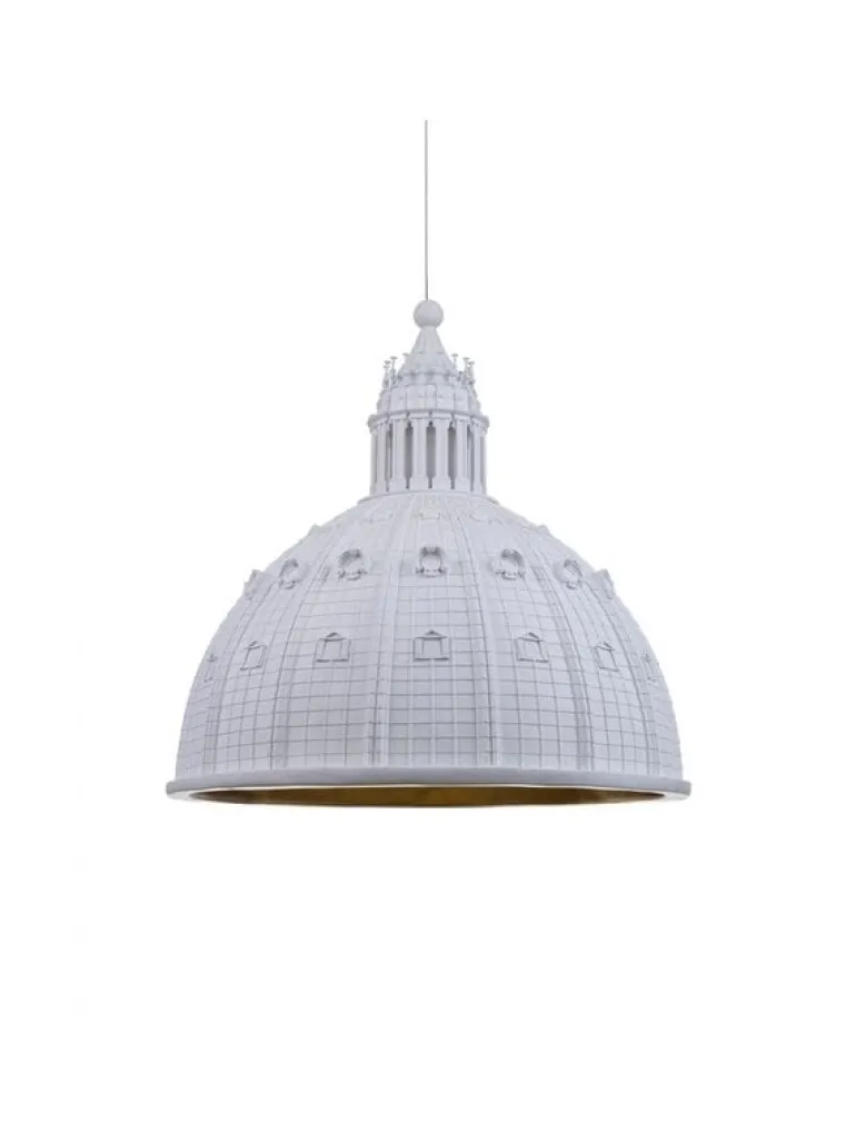 De Seletti Cupolone lamp is een reproductie van de koepel van San Pietro. De hanglamp van het Italiaanse interieurmerk is gemaakt van hars en heeft een afmeting van Ø45, hoogte 45cm. beschikbaar in verschillende afmetingen en kleuren.