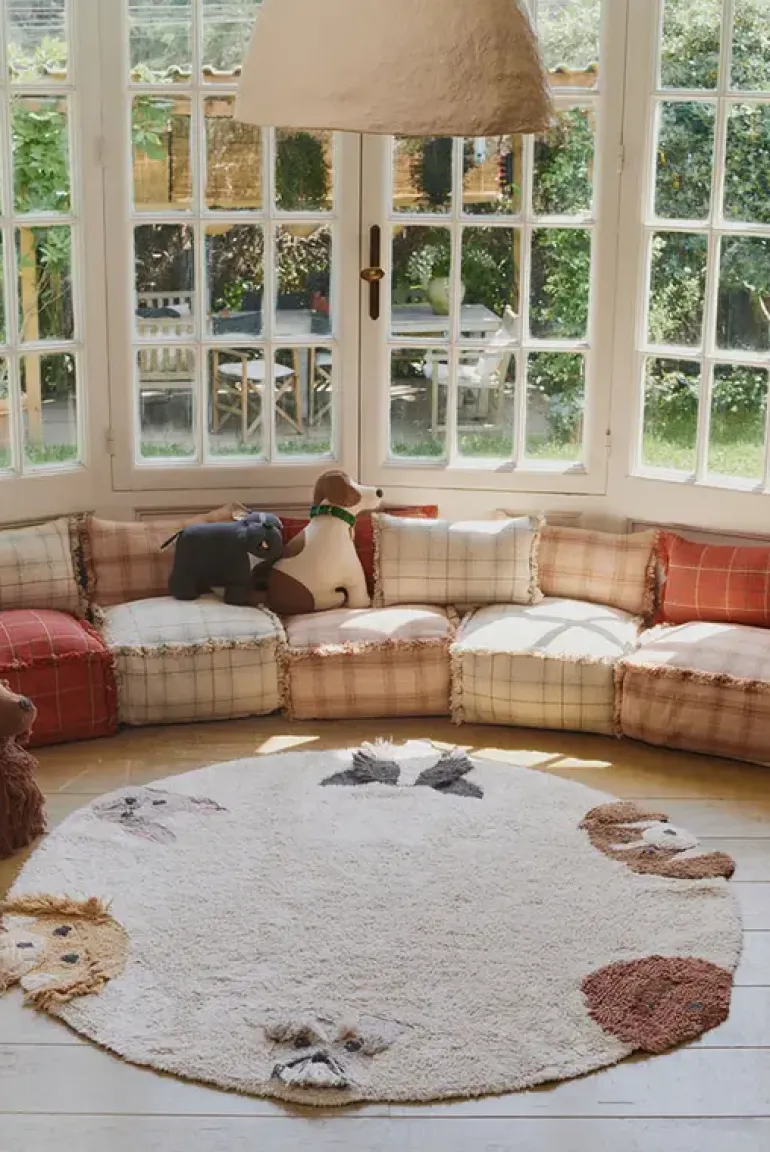 Ontmoet je zes favoriete harige vrienden! Het Lorena Canals Dogs vloerkleed is rond, wasbaar en heeft een natuurlijke kleur. Elke hond is handgemaakt, met unieke details zoals 3D-oren, snorharen en ogen gemaakt van knopen. Diameter 140cm
