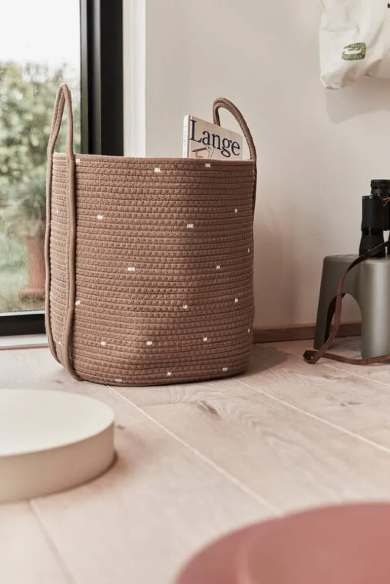 Handgemaakte katoenen manden van OYOY, elke mand heeft een andere afmeting. De OYOY Dot manden worden geleverd in een set van 2 stuks. Beschikbaar in meerdere kleuren. Afmeting 30x30x38 en 25x25x28cm