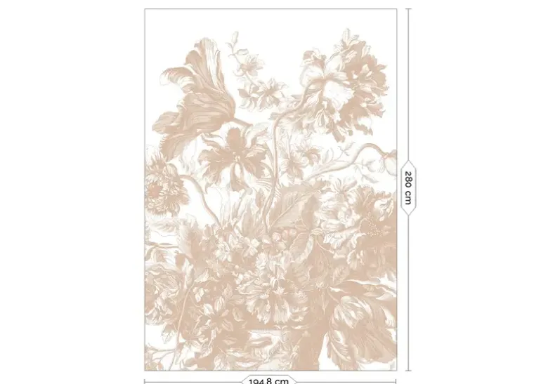 Frans Uyterlinde x KEK Amsterdam. Elegant bloemenbehang met een tijdloze uitstraling. Het KEK Amsterdam Engraved Flowers behang heeft een afmeting van 194,8x280cm (4 banen). Beschikbaar in verschillende afmetingen.
