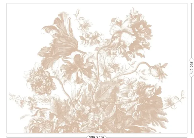 Frans Uyterlinde x KEK Amsterdam. Elegant bloemenbehang met een tijdloze uitstraling. Het KEK Amsterdam Engraved Flowers behang heeft een afmeting van 389,6x280cm (8 banen). Beschikbaar in verschillende afmetingen.