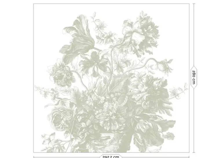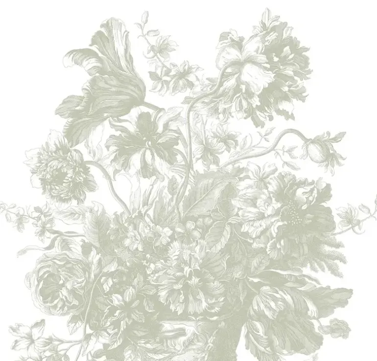 Frans Uyterlinde x KEK Amsterdam. Elegant bloemenbehang met een tijdloze uitstraling. Het KEK Amsterdam Engraved Flowers behang heeft een afmeting van 292,2x280cm (6 banen). Beschikbaar in verschillende afmetingen.
