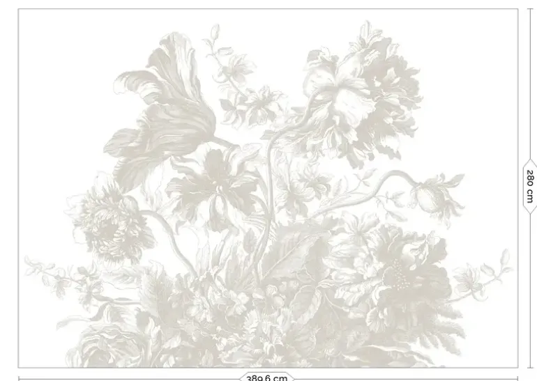 Frans Uyterlinde x KEK Amsterdam. Elegant bloemenbehang met een tijdloze uitstraling. Het KEK Amsterdam Engraved Flowers behang heeft een afmeting van 389,6x280cm (8 banen). Beschikbaar in verschillende afmetingen.