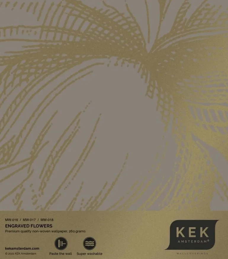 Prachtig goud behang met een mooie zijdeglans uitstraling van KEK Amsterdam. Het KEK Amsterdam Engraved flowers goud behang heeft een afmeting van 300x280cm (6 banen). Beschikbaar in verschillende afmetingen.