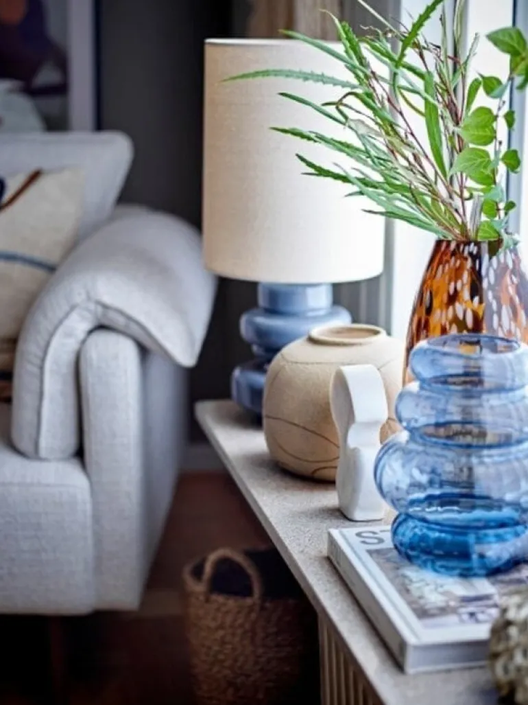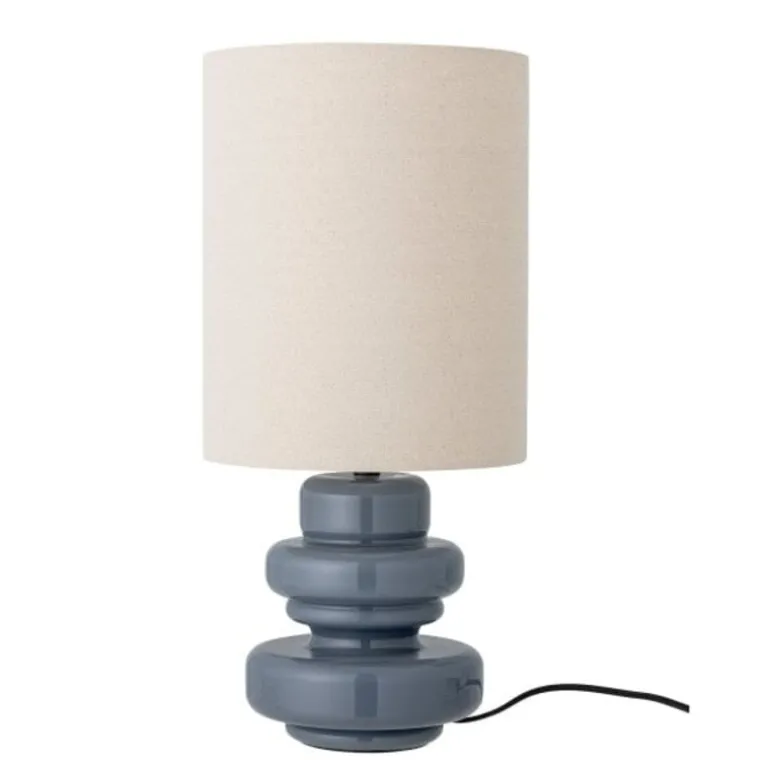 De Bloomingville Fabiola tafellamp heeft een blauw glazen lampenvoet met een mooie organische vorm. De lampenkap is gemaakt van linnen. Afmeting 24x24x51cm