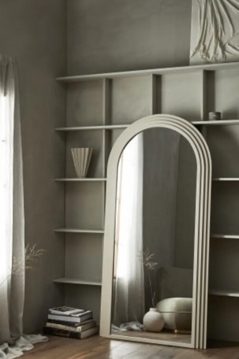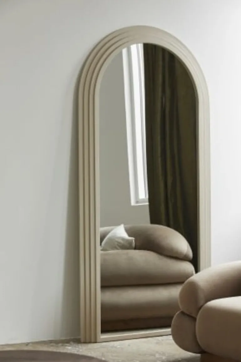 Mooie, grote spiegel met een ijzeren omlijsting in de kleur zand. De Nordal Falco spiegel heeft een hoogte van 203cm, breedte 100cm en 5,5cm diep. Kan aan de muur bevestigd worden of tegen de muur geplaatst worden.