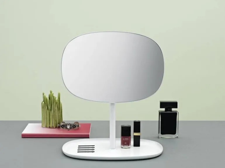 Handige Normann Copenhagen Flip spiegel. De Flip spiegel is ideaal te gebruiken omdat deze 360 graden draaibaar is. Het onderstel dient als schaal voor bijvoorbeeld sieraden of make-up. Past mooi in de minimalistische Scandinavische trend.