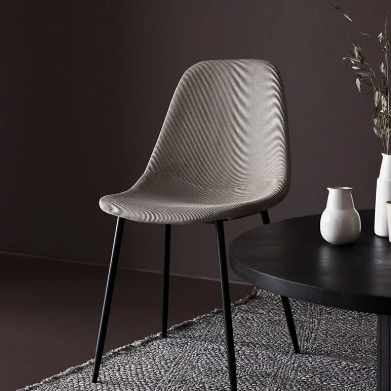 Prachtige eetkamerstoel van de sfeermaker uit Denemarken; House Doctor. Deze House Doctor Found stoel heeft zwarte metalen poten en een zand kleurige corduroy stof zitting. Afmeting l: 53 cm, w: 43 cm, h: 83.5 cm