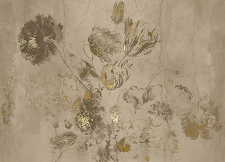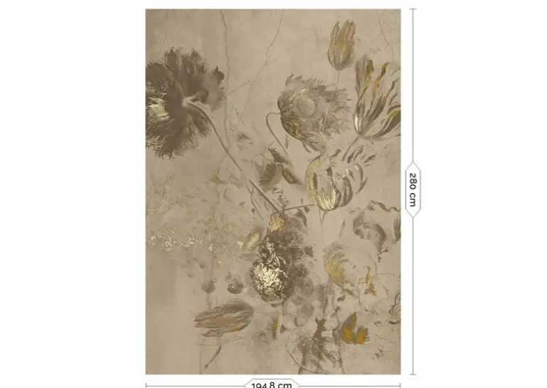 Frans Uyterlinde x KEK Amsterdam. Elegant bloemenbehang met een natuurstenen achtergrond en gouden accenten in hoogglans. Het KEK Amsterdam Fresco Flowers behang heeft een afmeting van 194,8x280cm (4 banen). Beschikbaar in verschillende afmetingen.