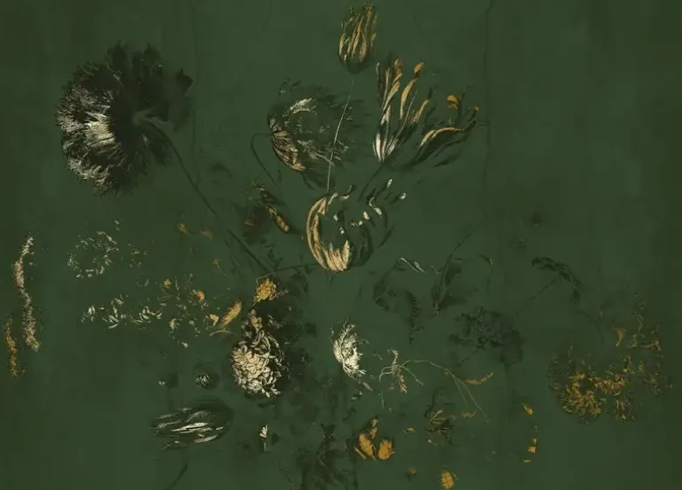 Frans Uyterlinde x KEK Amsterdam. Elegant bloemenbehang met een natuurstenen achtergrond en gouden accenten in hoogglans. Het KEK Amsterdam Fresco Flowers behang heeft een afmeting van 194,8x280cm (4 banen). Beschikbaar in verschillende afmetingen.