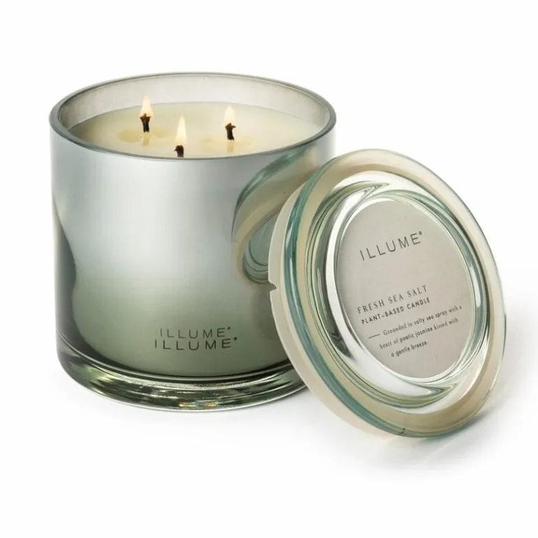 De Illume Fresh sea salt statement kaars met de geur van zoute zeespray, met een hart van poëtische jasmijn, en gekust door een zachte bries. Brandduur is tot 60 uur. Vegan, dierproefvrij, plantaardig. Afmeting Ø11,5x12cm