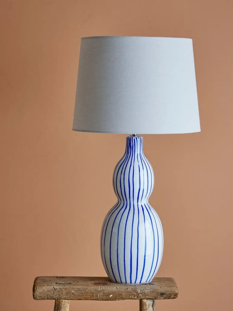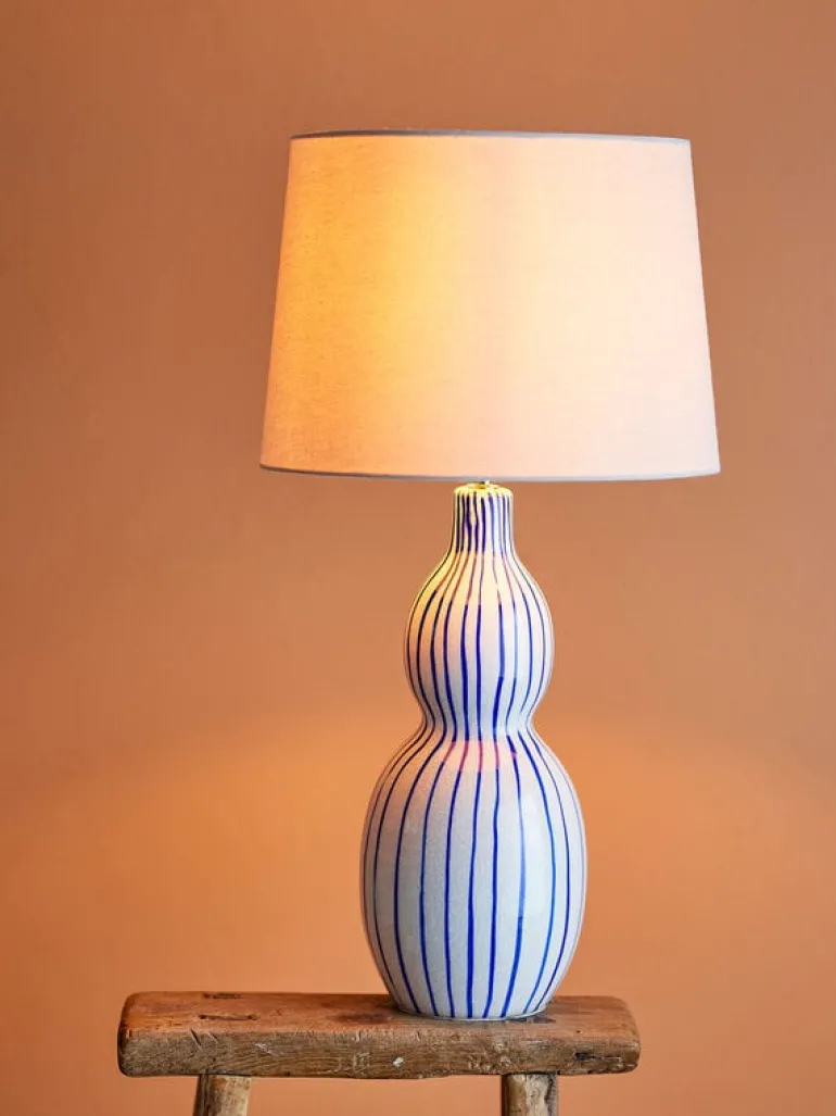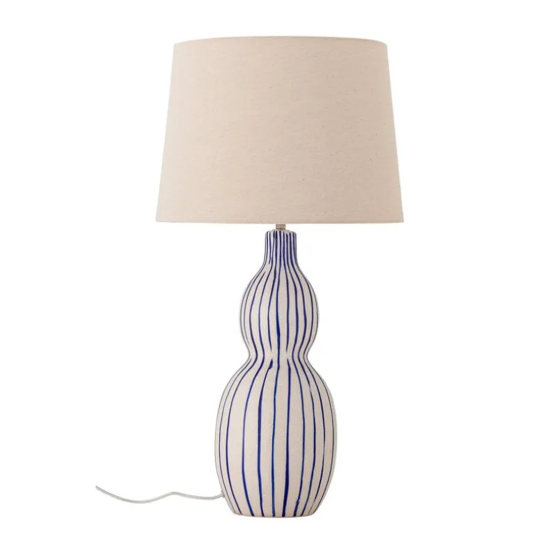 De Bloomingville Gavisa tafellamp is een stijlvolle en unieke lamp. De voet van de lamp is met de hand versierd met elegante blauwe strepen, terwijl de kap is gemaakt van natuurlijk linnen, wat een warme en gezellige sfeer creëert. Afmeting Ø35,5×68,5cm