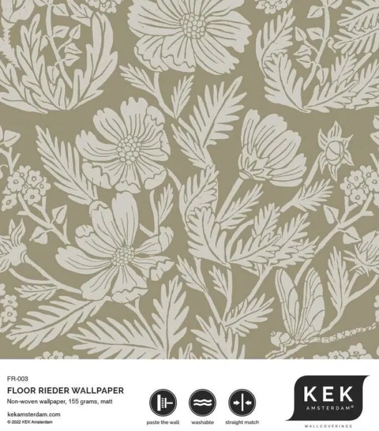 Mooi tijdloos behang uit de nieuwe behangcollectie van Kek Amsterdam, geïllustreerd door Floor Rieder. Het Kek Amsterdam getekende bloemen behang zand heeft een patroon van getekende bloemen, bladeren en takjes. Afmeting behang: 100x280cm.