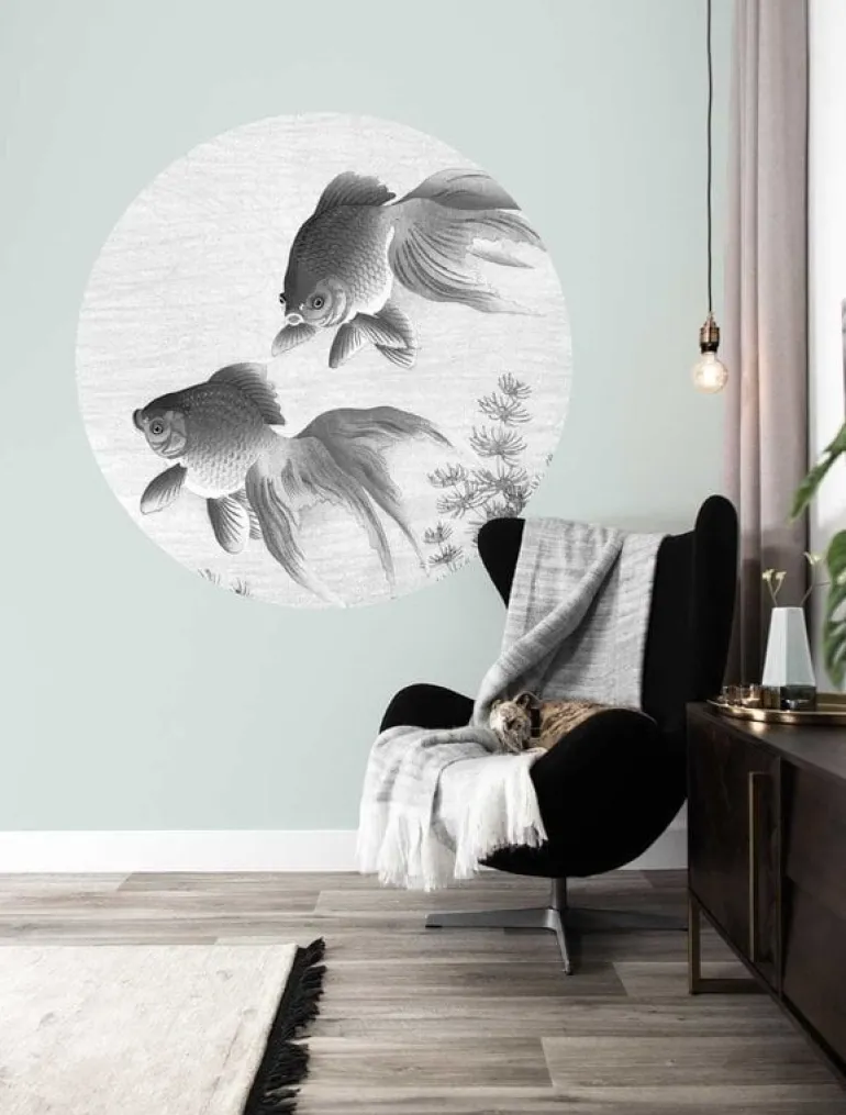 Prachtig hoogwaardig vliesbehang van KEK Amsterdam. De KEK Amsterdam Goldfish behangcirkel heeft geen coating waardoor het behang een super matte uitstraling heeft. Beschikbaar in verschillende afmetingen. Afmeting ø 142,5 cm (3 banen)