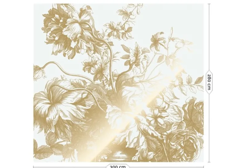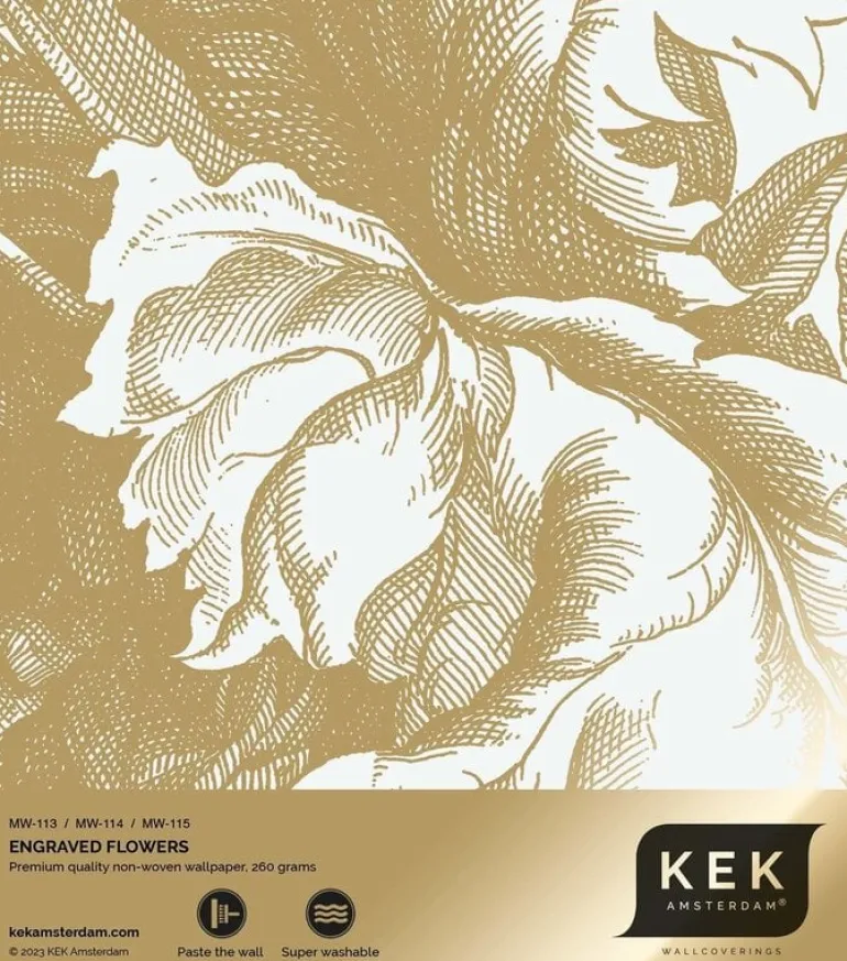 Prachtig bloemen behang van KEK Amsterdam. Het KEK Amsterdam Goud Engraved bloemen behang off-white heeft een zijdeglans uitstraling. Het behang heeft een afmeting van 300x280cm (6 banen). Beschikbaar in verschillende afmetingen en kleuren.