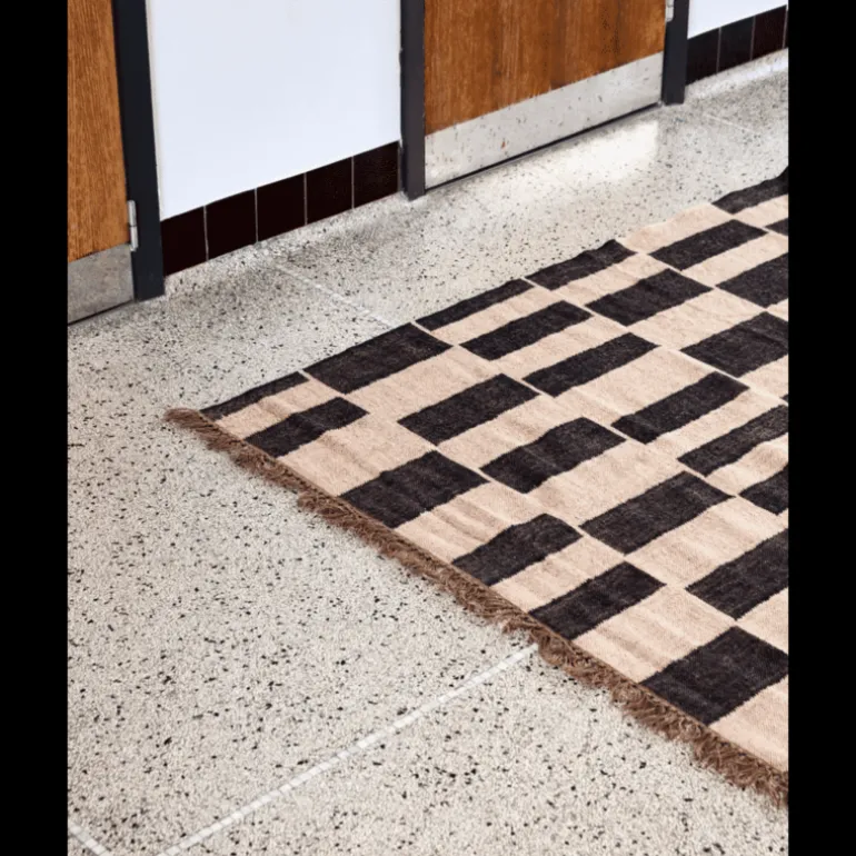 Met een mix van zwarte en natuurlijke tinten zorgt dit handgemaakte House Doctor Graph vloerkleed direct voor karakter in je interieur. Het vloerkleed heeft een asymmetrisch patroon en speelse franjes. Afmeting 180x180cm