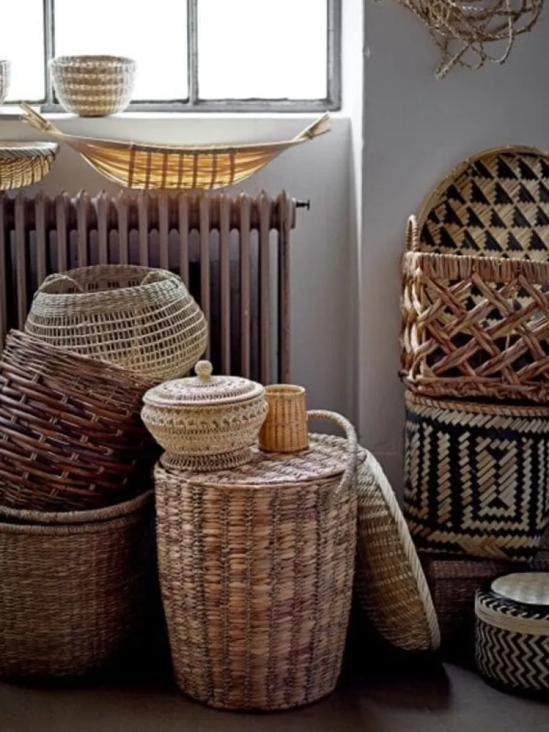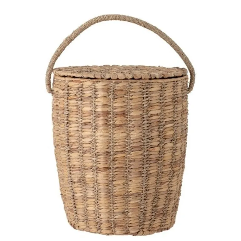 Mand met deksel van het Deense interieurmerk Bloomingville. Handig om spullen in op te bergen. De Bloomingville Gulla mand is gemaakt van water hyacinth, zeegras en ijzer. Afmeting D35xH42 cm