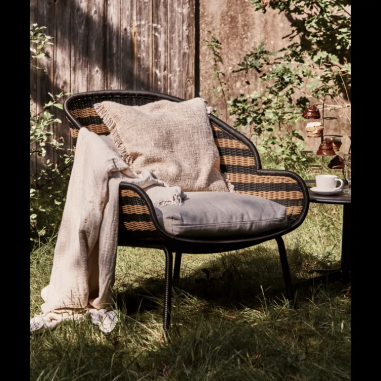 De House Doctor Hapur loungestoel is bekend uit eerdere collecties en nu beschikbaar in de kleur naturel en zwart. Geschikt voor zowel binnen als buitengebruik. Afmeting 85x80x88cm