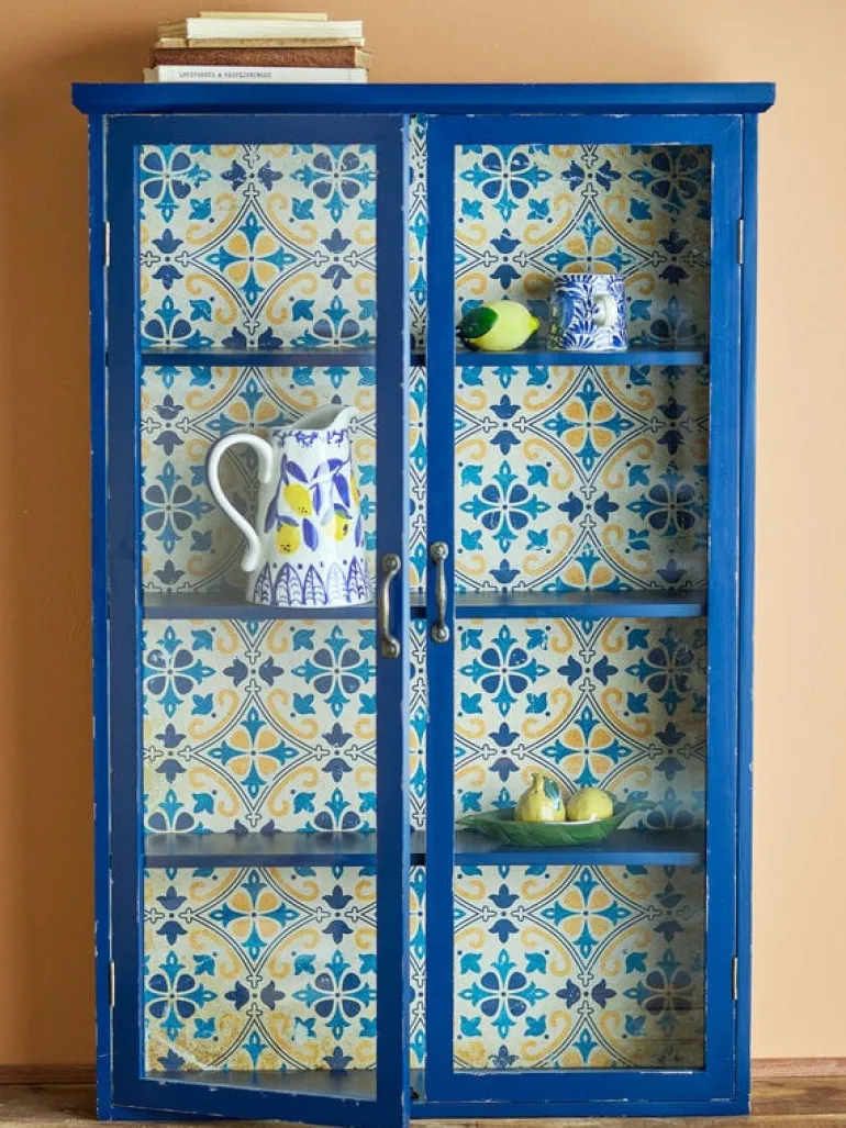 De Bloomingville Hazem kast is een karaktervolle kast. De kast heeft een elegante, verweerde afwerking die een vintage look toevoegt. De achterkant van de kast is versierd met een decoratieve papierprint geïnspireerd op Portugese tegels. 81x122x22cm