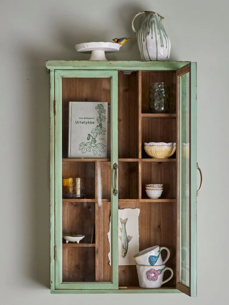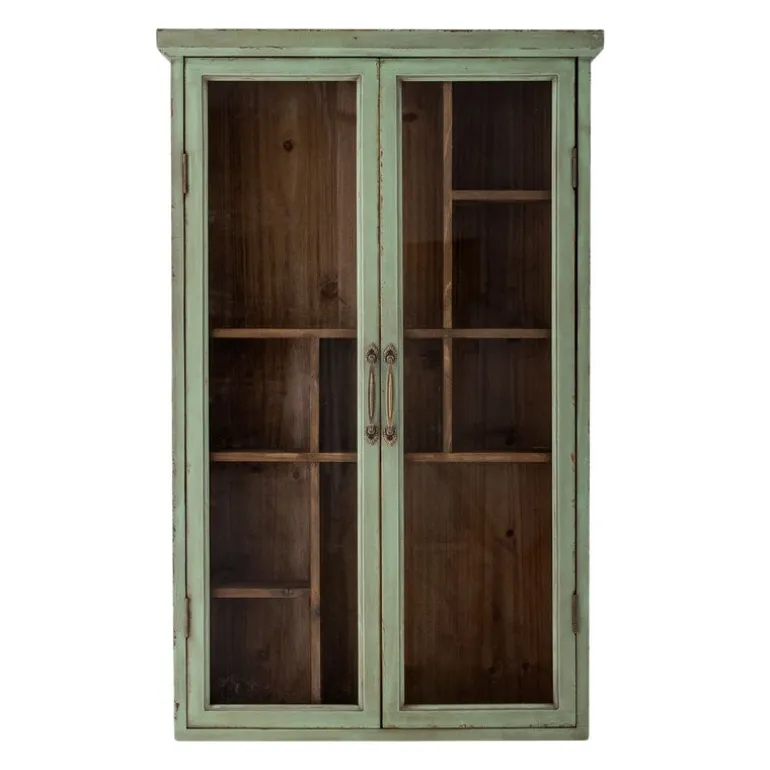 De Bloomingville Hazem kast is een klein wandkastje. Ontworpen in een prachtige groene kleur met een verweerde look. Door de glazen deuren is de kast ideaal voor het decoratief opbergen van bijvoorbeeld kleine decoratieve spullen. Afmeting 50x80x13,5cm