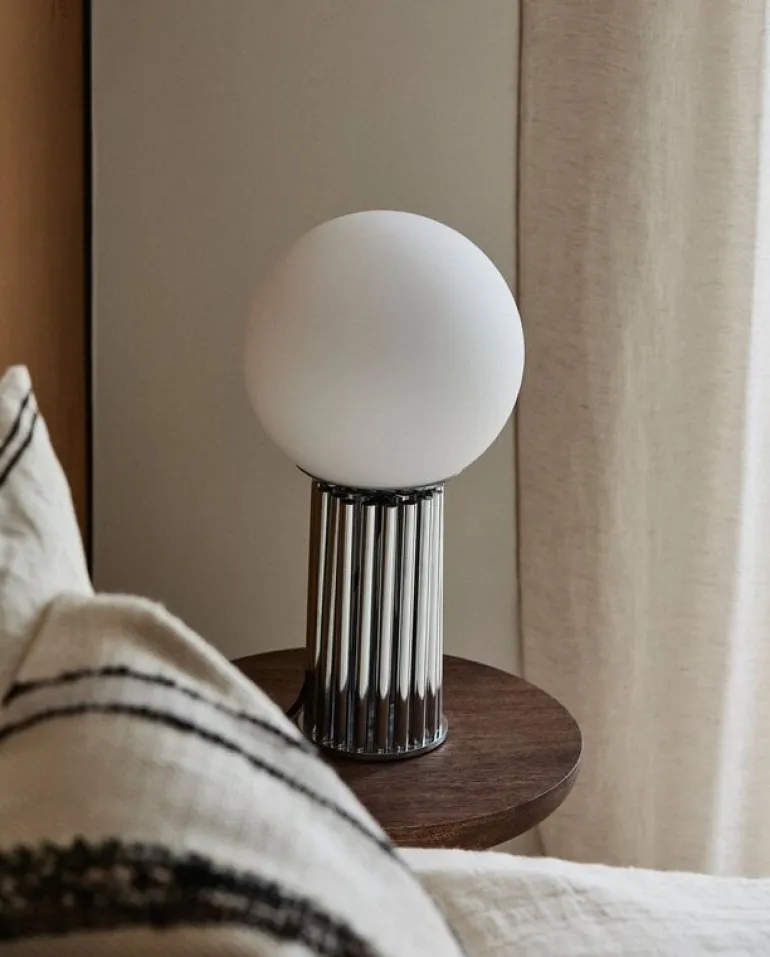 Prachtige tafellamp van Nordal. De Nordal Hermes tafellamp heeft een lampenkap gemaakt van wit melkglas en de voet is van verchroomd metaal. De lamp heeft een afmeting van Ø19,5×38,5cm.