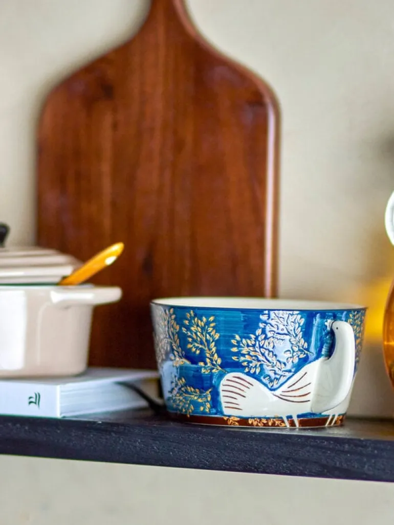 De Bloomingville Hezha schalen zijn gemaakt van aardewerk en met de hand beschilderd met een prachtig vogelmotief. Het blauwe glazuur geeft een rustige en mooie tint. Wordt geleverd in een set van 6 stuks. Afmeting Ø13x7cm