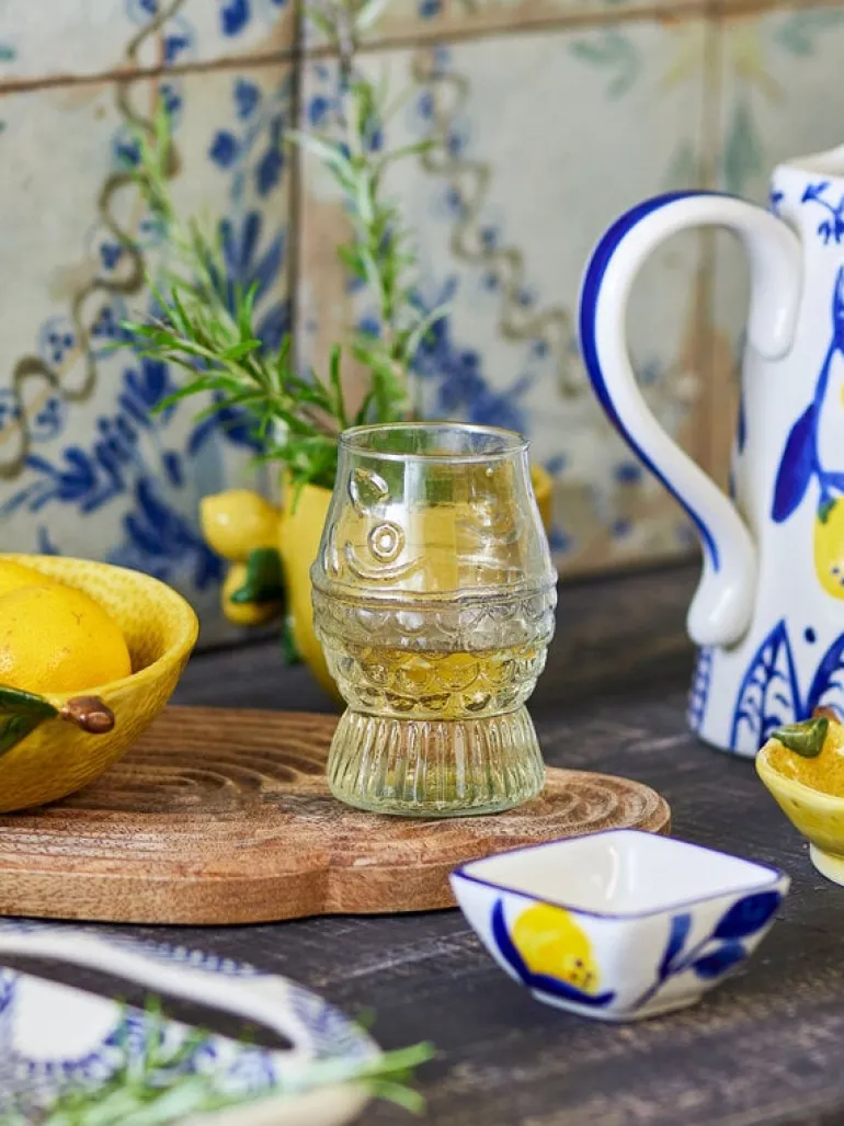 De Bloomingville Kadir glazen zijn gemaakt van gerecycled glas en hebben een unieke vorm die is geïnspireerd op een vis. De gedetailleerde textuur en het vismotief creëren een charmante en speelse expressie. Wordt geleverd in een set van 6 stuks. Ø7,5x12c