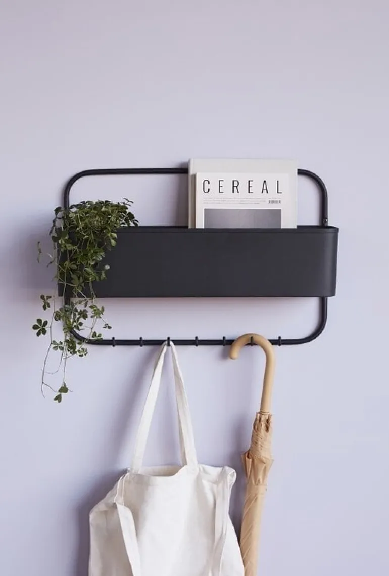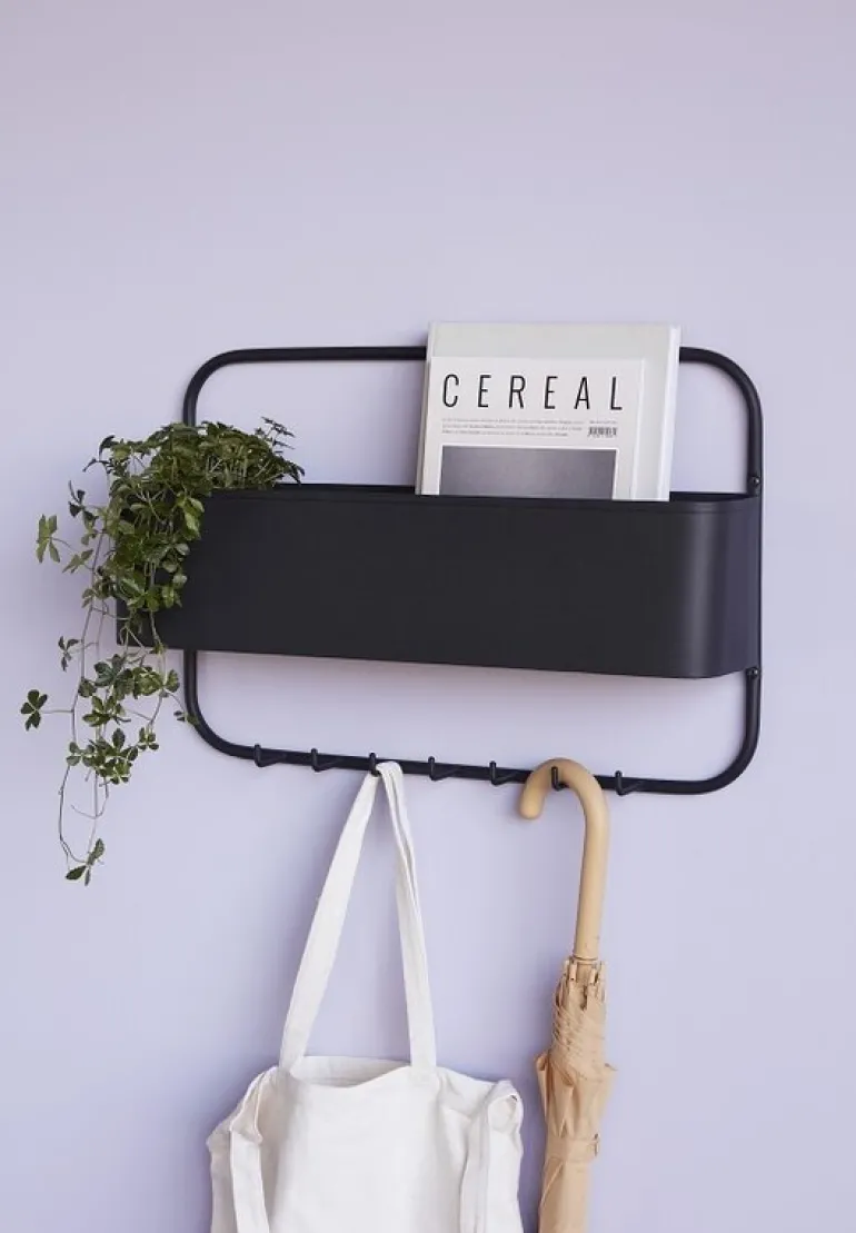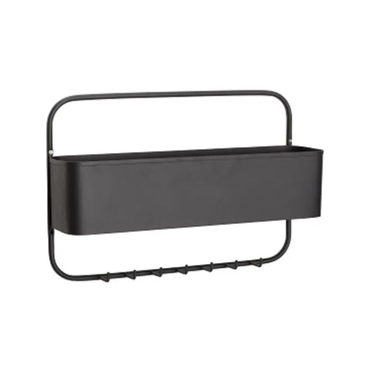 Moderne kapstok van het Deense interieurmerk Hubsch. De kapstok heeft als leuk detail opbergruimte. Gemaakt van metaal in de kleur zwart. Afmeting 62x41x16cm