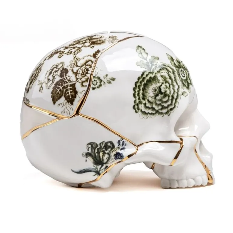 Ontdek de schoonheid van de Kintsugi producten, gemaakt van fijn porselein en verfraaid met echt 24-karaats goud. Het Seletti Kintsugi Skull decoratie object heeft een afmeting van 21x15x16cm.