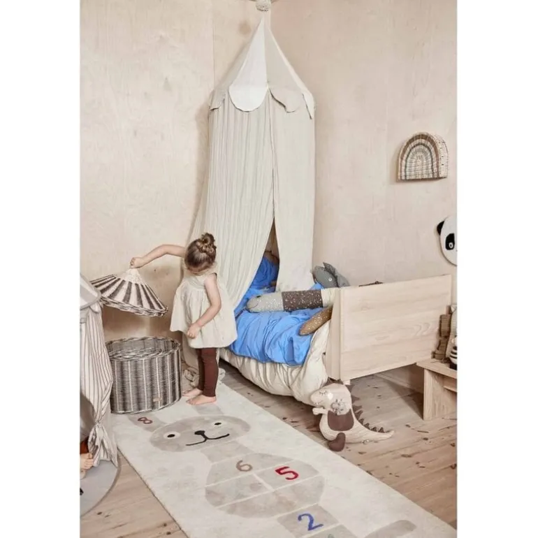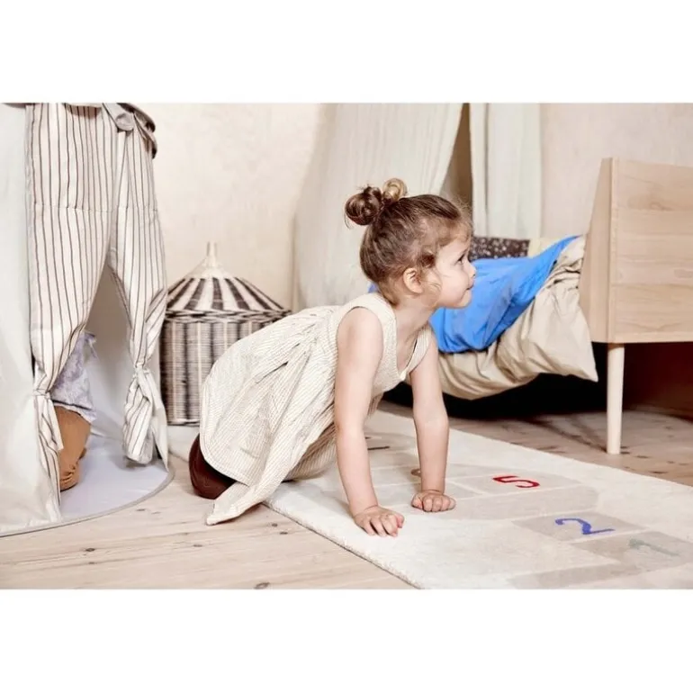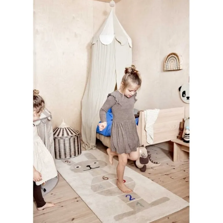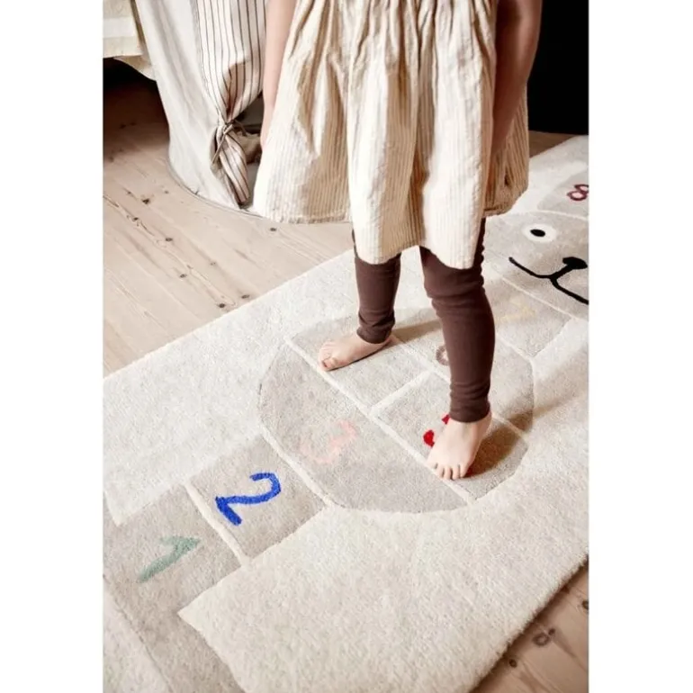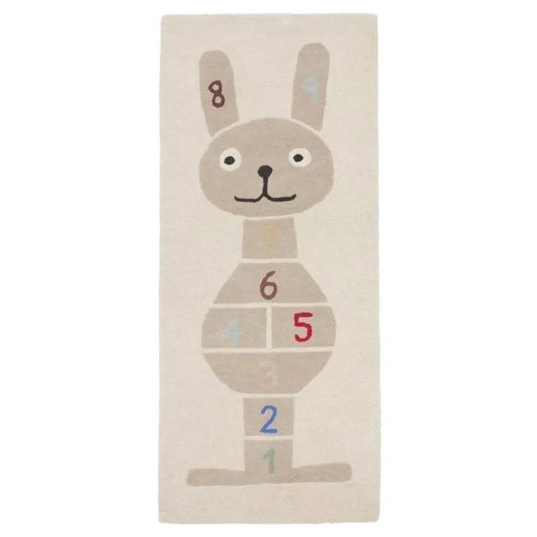 Prachtig vloerkleed van het merk OYOY. Het OYOY Konijn vloerkleed is gemaakt van 80% wol en van 20% katoen. Het kleed heeft een print van een konijn met een hinkelbaan. Het vloerkleed heeft een afmeting van 180x75cm