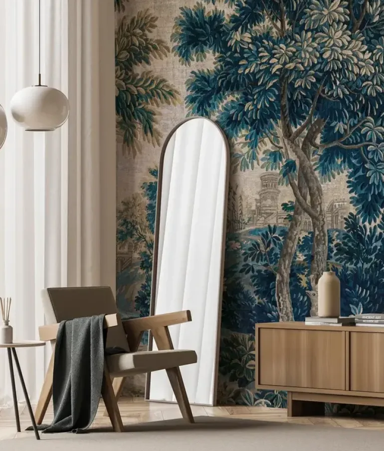 Een dergelijk wandkleed hing vroeger in herenhuizen en kastelen. Nu heeft KEK Amsterdam er een behangprint van hebben gemaakt. Het KEK Amsterdam Landscape Tapestries behang is beschikbaar in 3 formaten. Afmeting 300x280cm (6 banen)