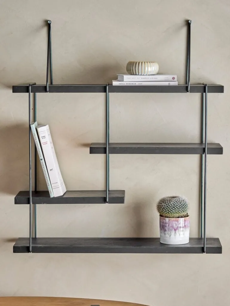 De Bloomingville Lewis Shelf is gemaakt van zwart hout en heeft een ontwerp met asymmetrische planken. Dit maakt een creatieve organisatie en weergave van boeken, planten of andere decoratieve items mogelijk. Afmeting 60x15x65cm