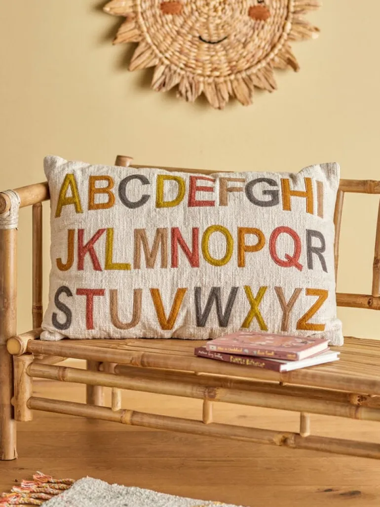 Het Bloomingville Mini Lexi kussen is gemaakt van katoen en versierd met het alfabet in mooie, kleuren. Het kussen is zowel decoratief, gezellig als educatief: de perfecte combinatie. Afmeting 60x40cm