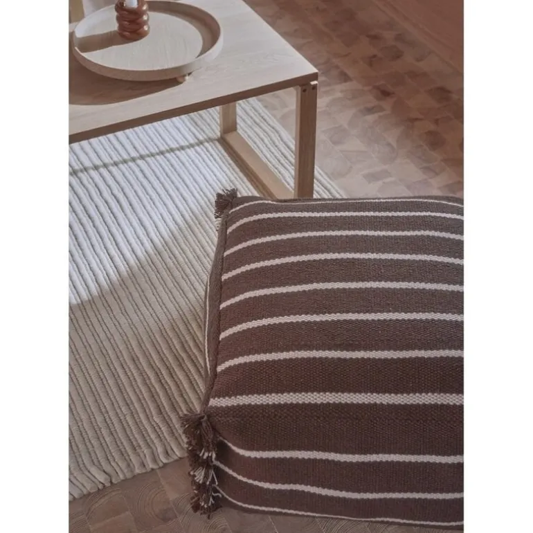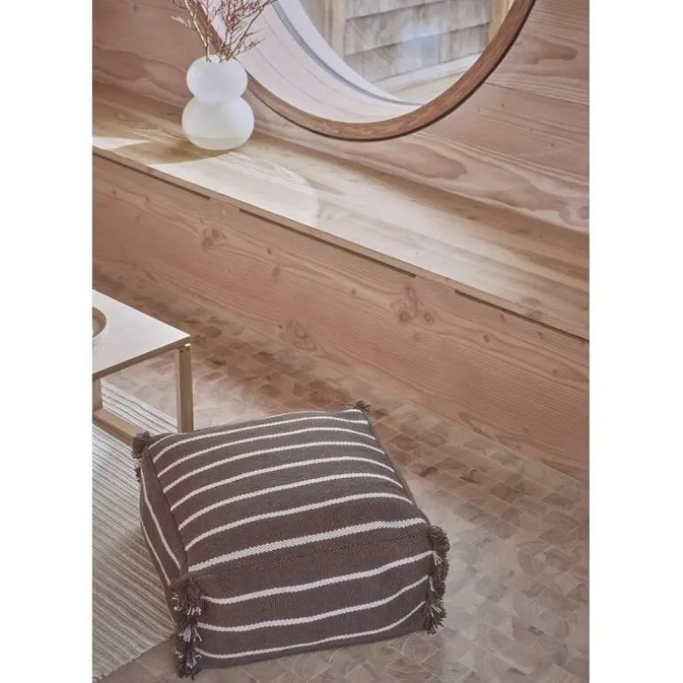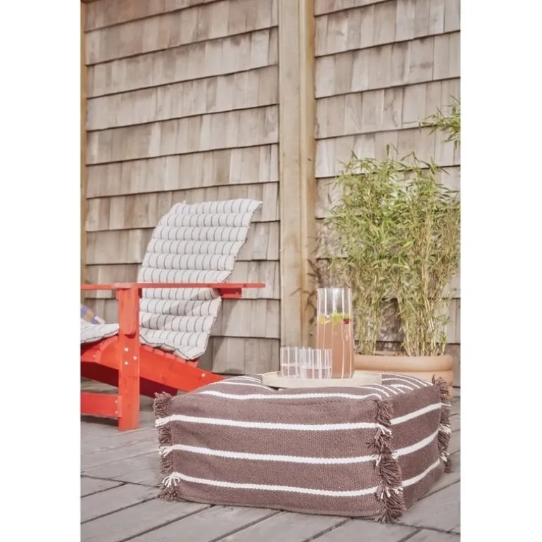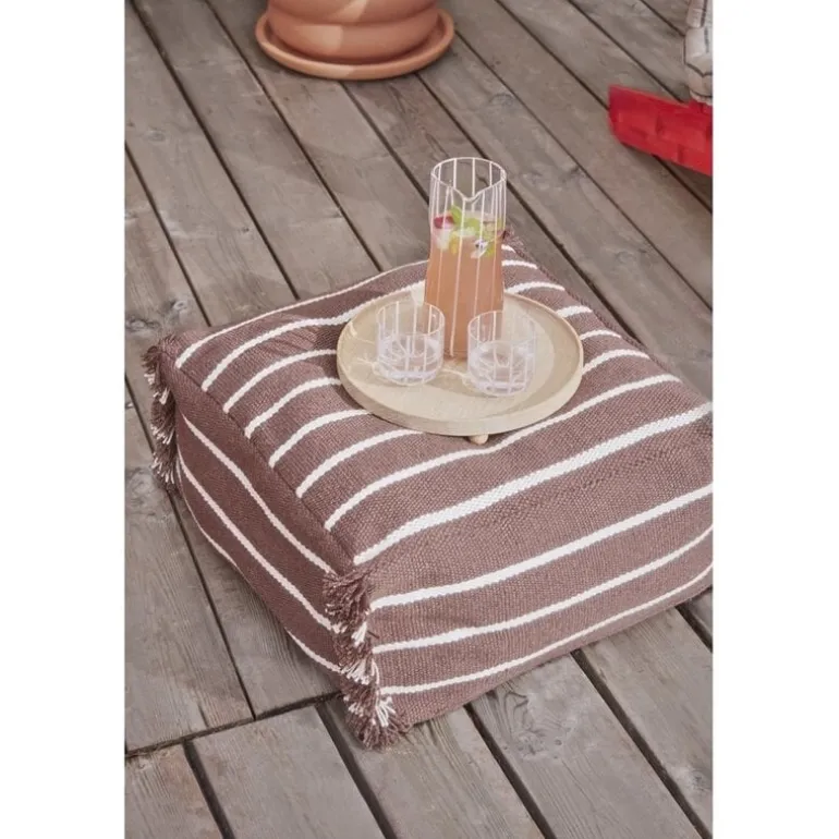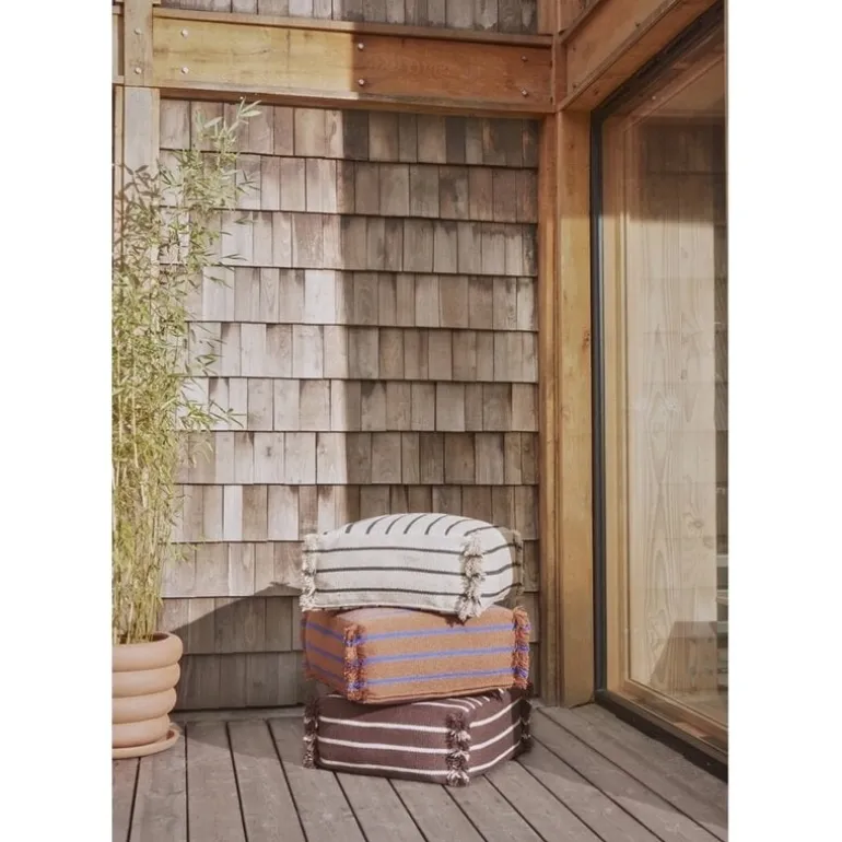 Mooie poef met strepen en franjes op alle zijdes van het interieurmerk OYOY. De OYOY Lina poef is beschikbaar in drie kleuren. Afmeting 62x62x32cm