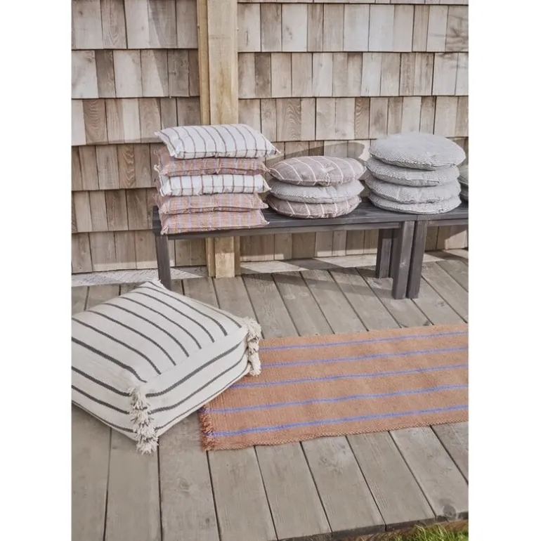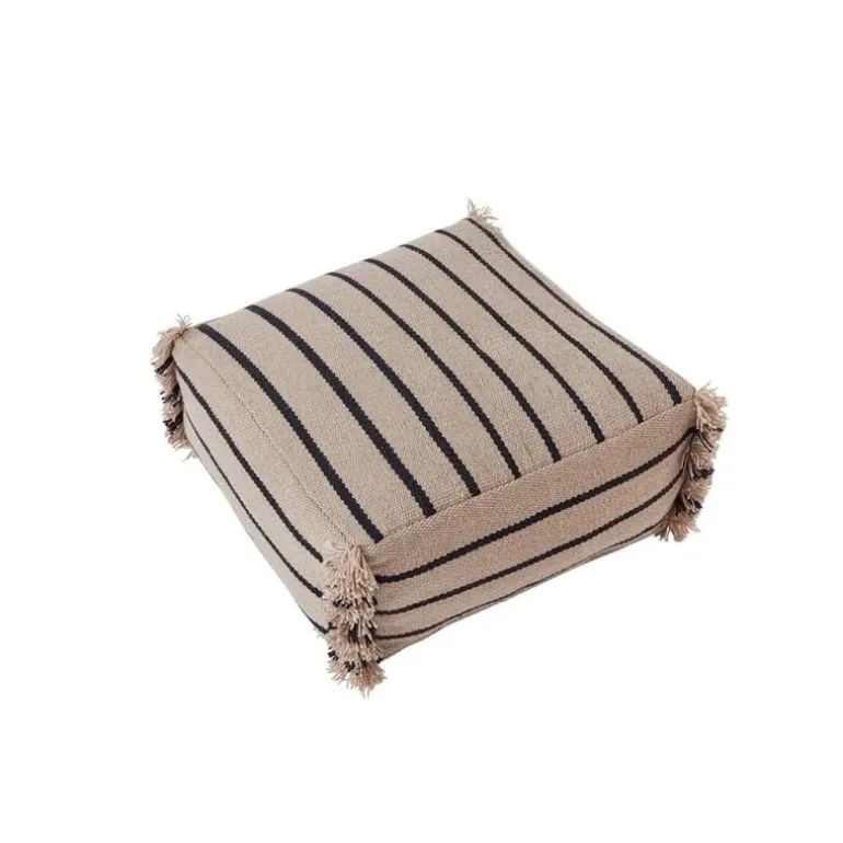 Mooie poef met strepen en franjes op alle zijdes van het interieurmerk OYOY. De OYOY Lina poef is beschikbaar in drie kleuren. Afmeting 62x62x32cm